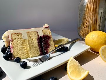 Lemon cake, blueberry basil jam, lemon curd, fresh blueberries, lemon buttercream