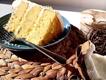 Coconut sponge, Malibu syrup, coconut cream filling, white chocolate whipped ganache