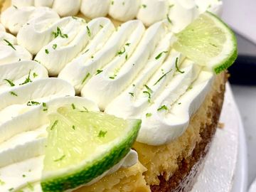 Key lime and yuzu cheesecake, classic crust, whipped cream, lime zest