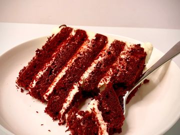 Deep red velvet cake, cream cheese mousse, chocolate ganache, cream cheese frosting, cake crumbs. A fan favorite!